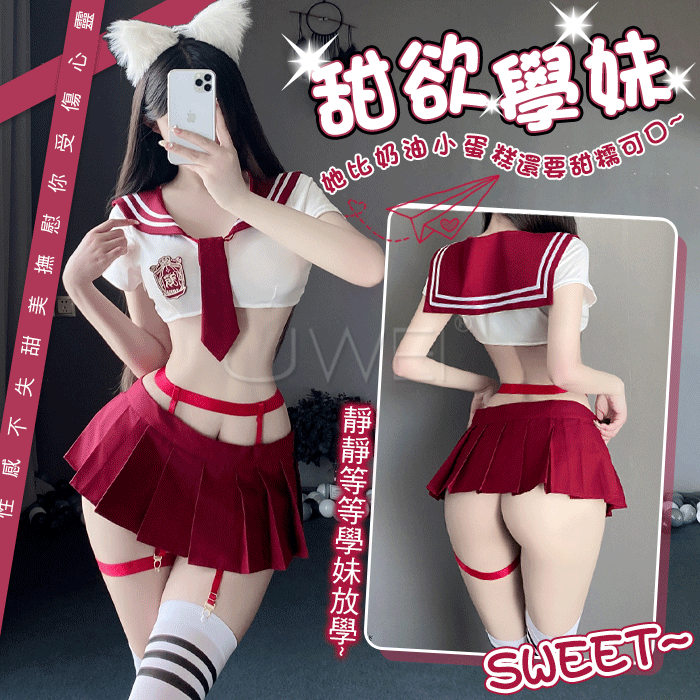 | 甜心刑警.胸前交叉繫帶清純百褶透視白紗COS制服套裝【上衣+短裙-粉+白】