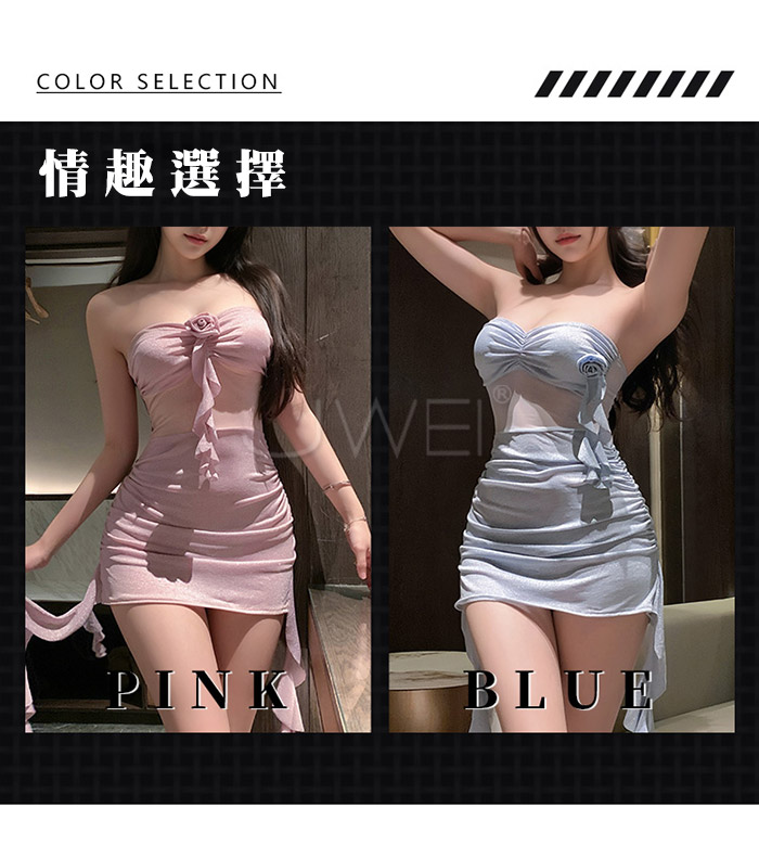 ►您現在的位置:首頁>甜欲風情.性感抹胸可拆卸玫瑰花胸針點綴抽褶包臀連身裙-藍色【連身裙+可拆式胸針+T褲】