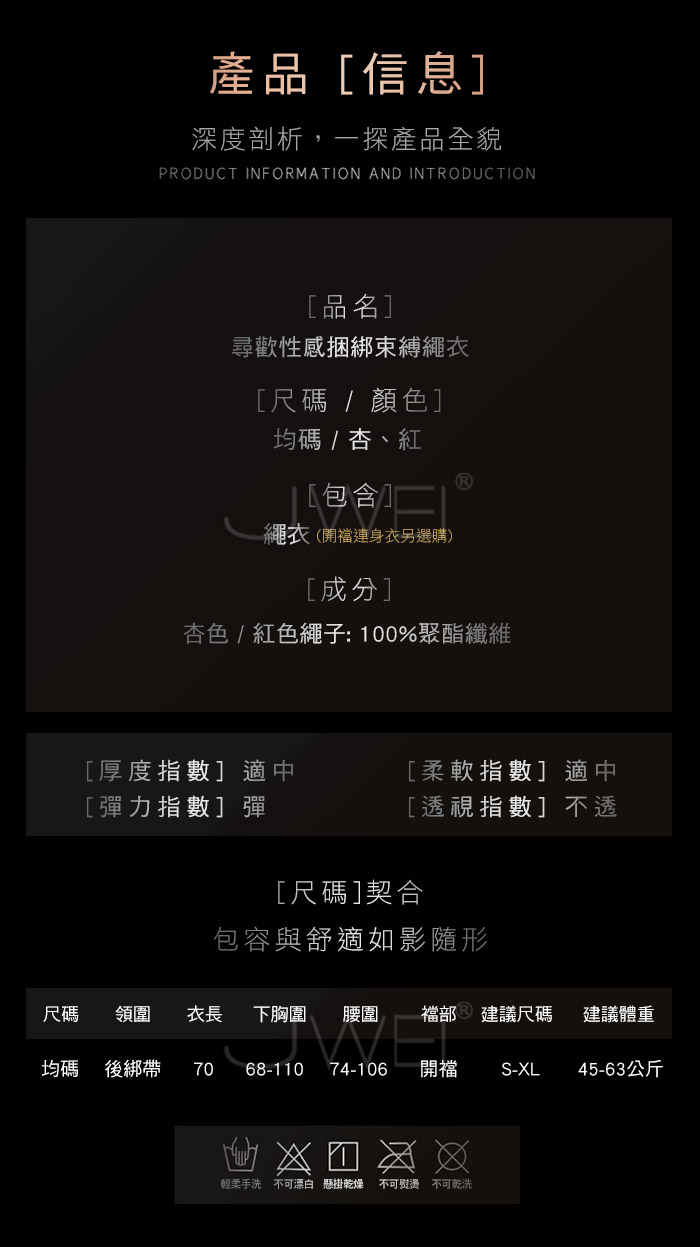 ■內容物:單件繩衣 ■適穿尺寸:FREESIZE ■未撐開平量尺寸正負誤差1~2cm,1吋=2.54cm ■注意事項:基於保障消費者個人衛生,此貼身衣物恕不接受退換貨。 (如為商品本身暇疵,接受七日內換貨,請勿試穿,謝謝您) ■材質: 聚脂纖維 ■注意:SM道具請以安全、清醒、非強迫為使用原則,使用前請先徵得對方的同意;使用時如有任何不適,請立即停止使用。