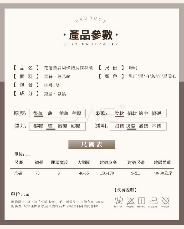 ■內容物:長筒絲襪*1 ■適穿尺寸:FREESIZE ■彈性:彈 ■未撐開平量尺寸正負誤差1~2cm,1吋=2.54cm ■注意事項:基於保障消費者個人衛生,此貼身衣物恕不接受退換貨。 (如為商品本身暇疵,接受七日內換貨,請勿試穿,謝謝您)