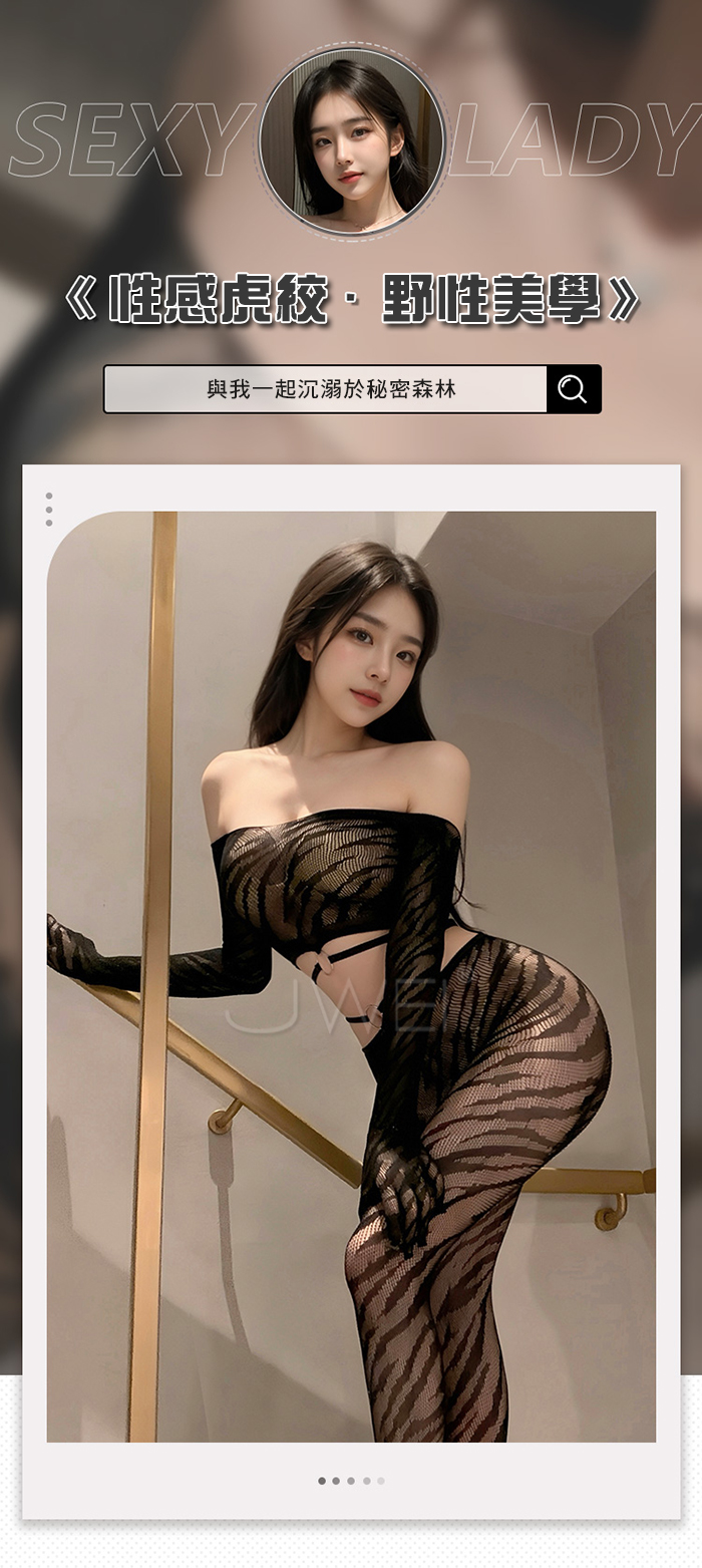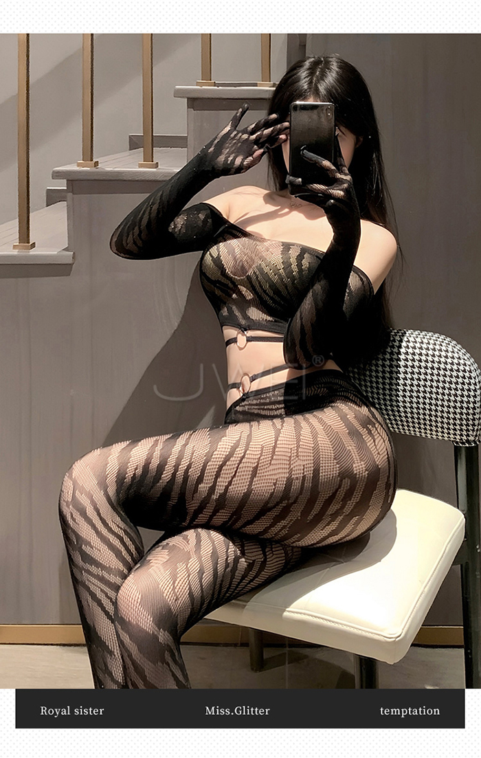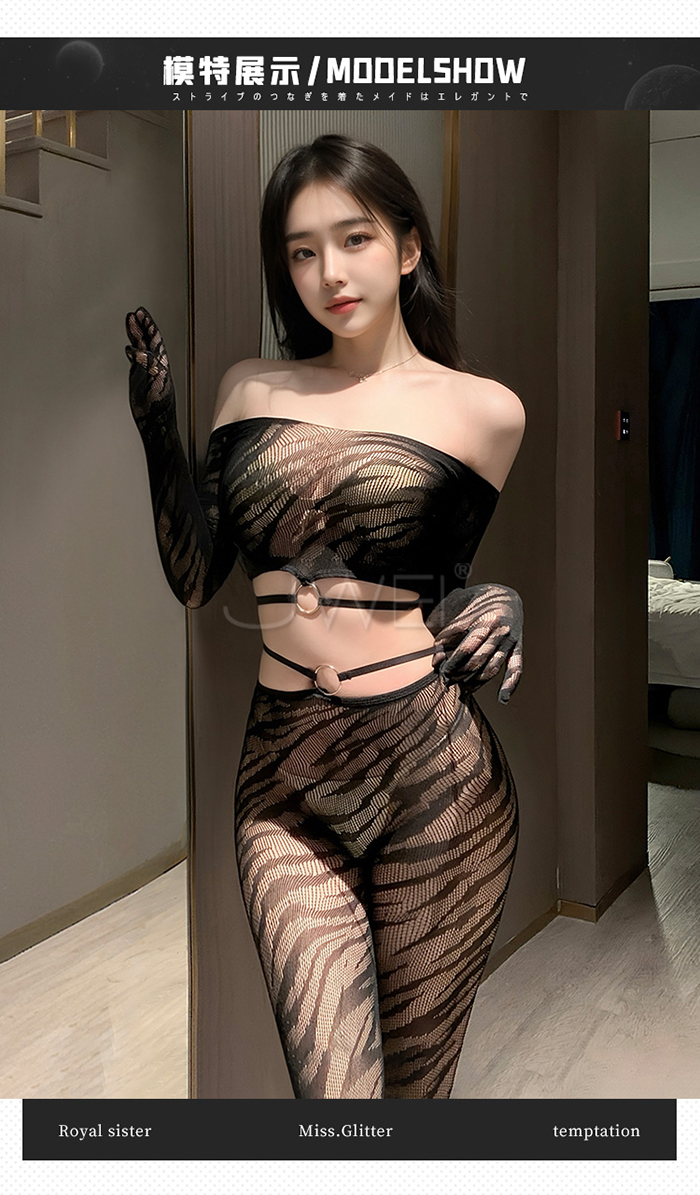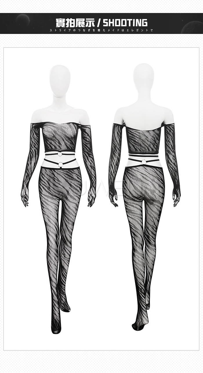 首頁>野性美學.性感虎紋一字肩環飾透胸分體式露腰網襪套裝【一字肩網衣+連褲襪】