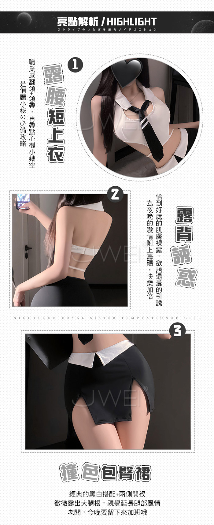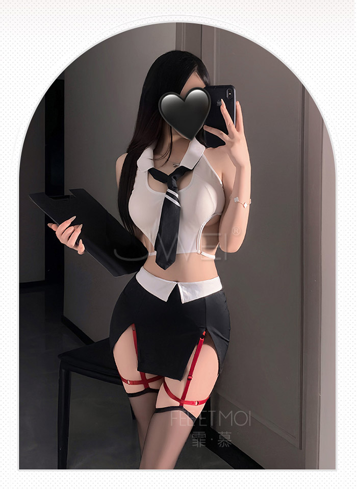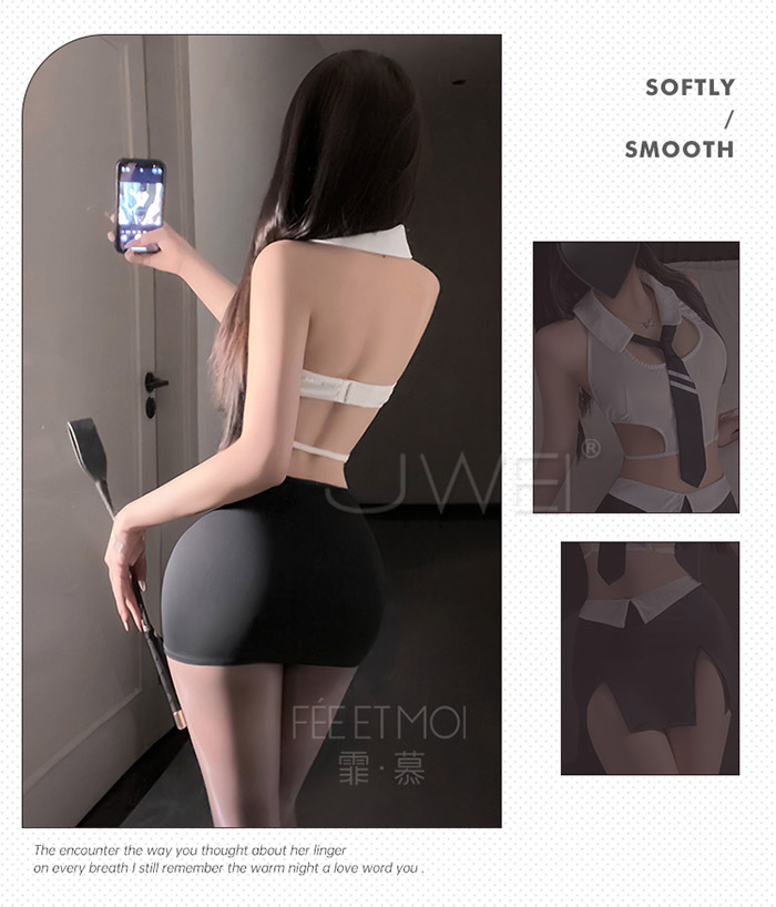 首頁>OL領域.挖空露腰美背撞色雙開衩包臀裙OL小秘制服套裝【上衣+領帶+包臀裙+內褲】