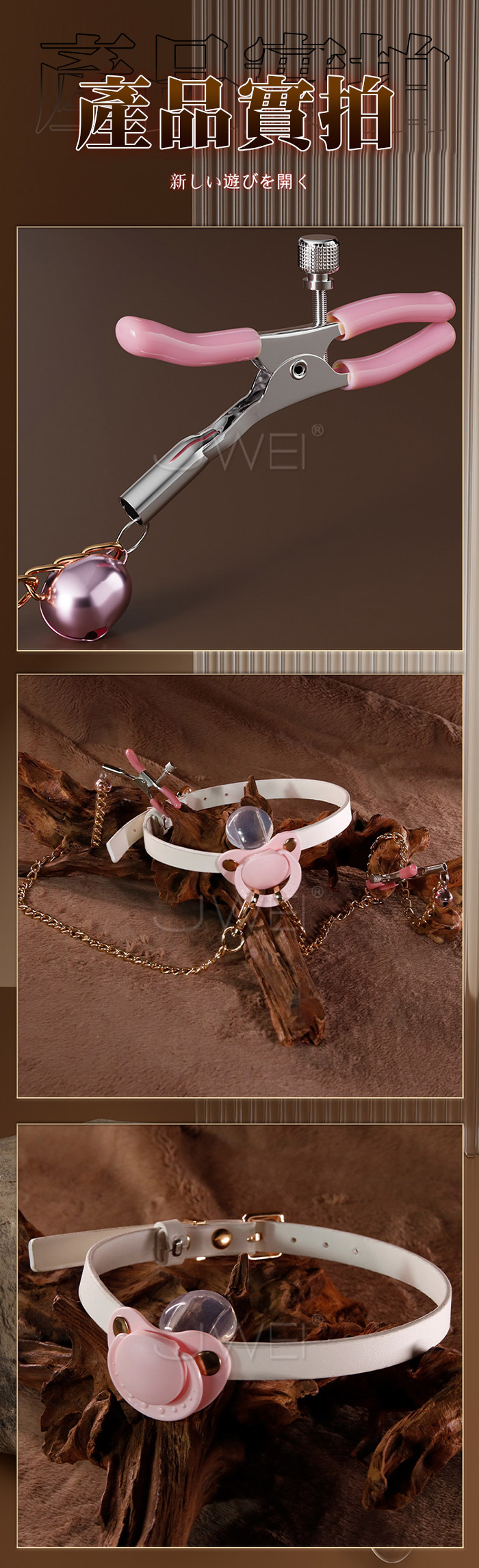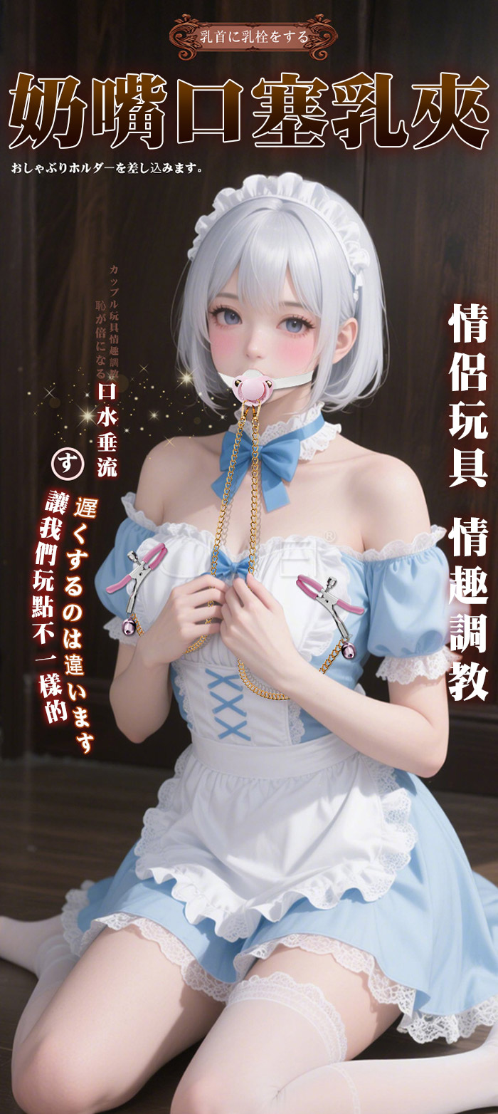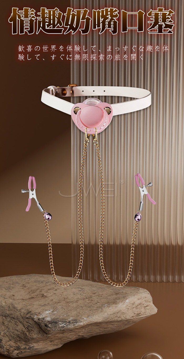 情侶玩具 羞恥調教 奶嘴口塞乳夾 口水流垂 奶嘴設計矽膠材質的奶嘴Q彈耐用軟萌可愛 乳夾鈴鐺隨著身體擺動而循序漸進,乳此動聽 產品規格 ■尺寸:大小詳如圖片標示 ■材質:皮革+合金+矽奶嘴 ■特色:增進情趣 ■SM用品屬於特殊情趣用品,需在雙方清醒自願的情況下使用,該物品僅作為情趣用品使用,使用時應注意安全!!