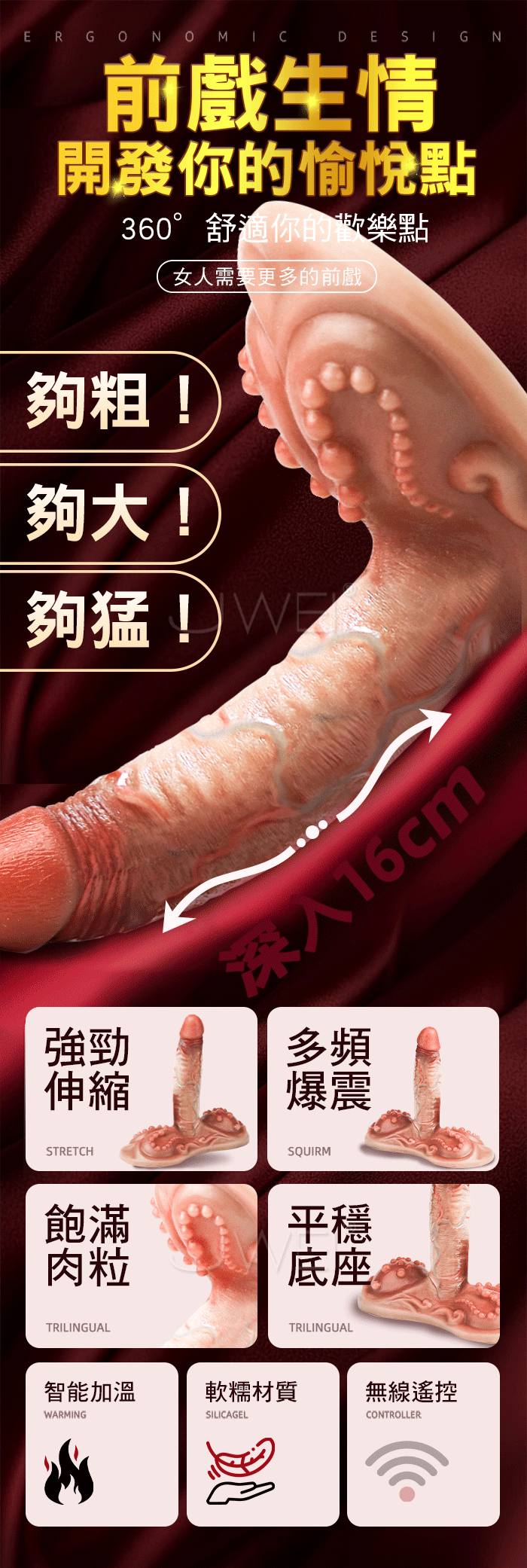人體工學設計,全自動體感伸縮,專為亞洲女性設計,全新震動伸縮搖擺陽具 前戲生情,開發你的愉悅點,360度舒適你的歡樂點,夠大!夠粗!夠猛! 仿真復刻肉感,柔軟呵護私處,健康材質 放心嗨爽,可口含的液態矽膠! 飽滿龜頭仿真肌理,看得見的清晰紋理 摸得著的青筋褶皺 ■尺寸:大小詳如圖片標示 ■材質:液態矽膠+ABS ■特點: 6頻震動、6頻伸縮、無線遙控、加溫