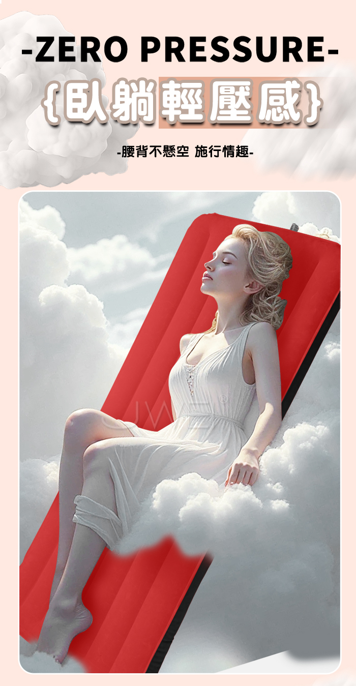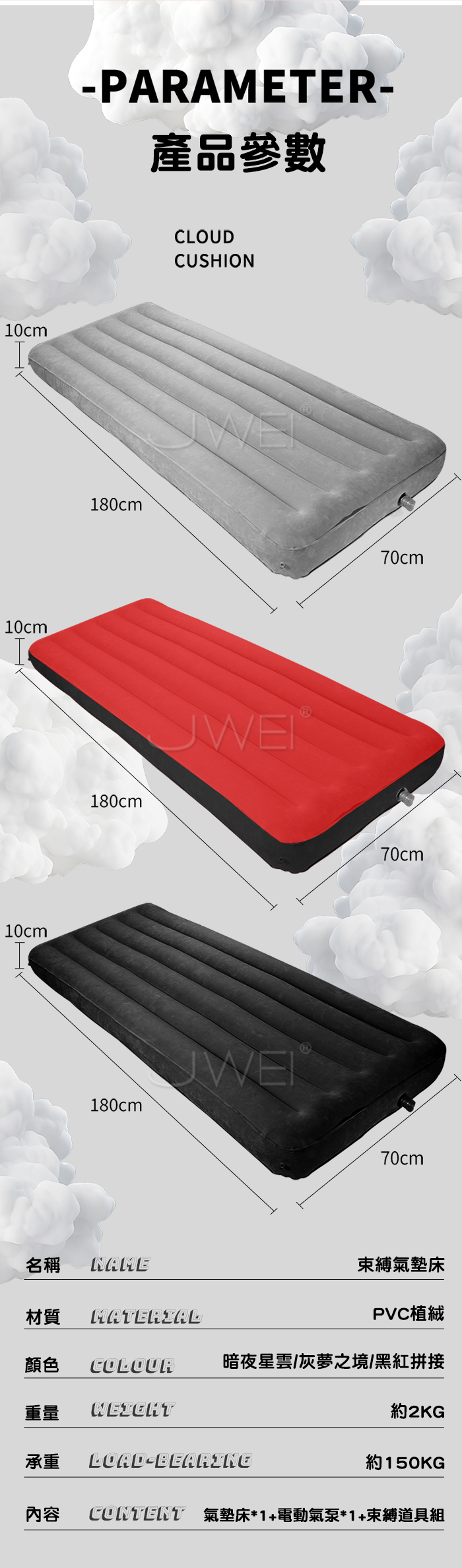讓愛漂浮在雲端,SEX 充氣情趣床墊 輕柔而充滿情趣,不估空間,增添情趣 彈力十足回彈迅速,格柵紋理 有效支撐身體背部 ■尺寸:大小詳如圖片標示 ■材質:PVC植絨 ■注意: SM道具請以安全、清醒、非強迫為使用原則, 使用前請先徵得對方的同意