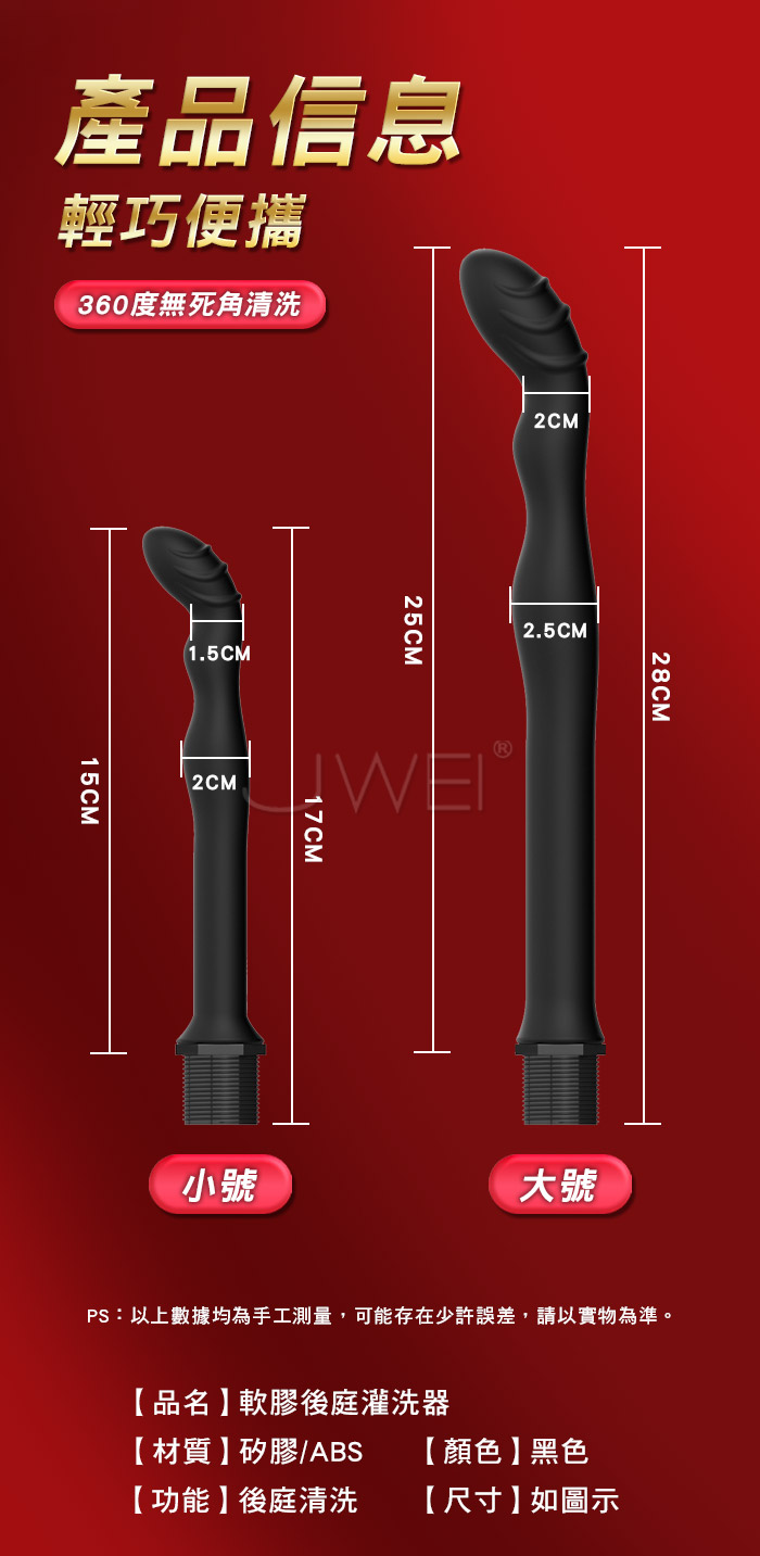 灌腸沖洗,柔軟舒適不撐大,乾淨沖洗零死角 不銹鋼連接水管,洗澡的時候隨時連接,隨意彎曲不折斷 刺激不同敏感區,喜歡水花噴湧而出的快感,一邊清洗一邊爽 產品規格 ■尺寸: 大小詳如圖片標示 ■材質: TPE+ABS