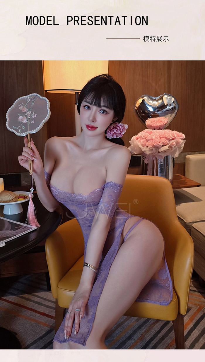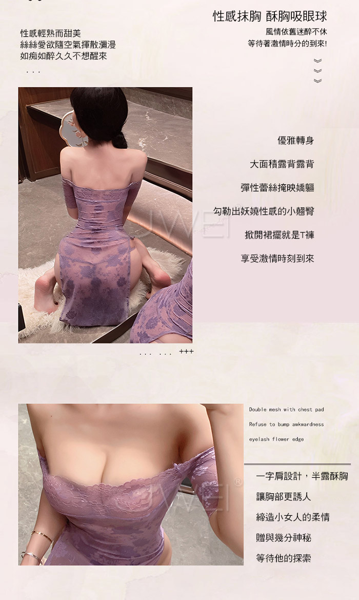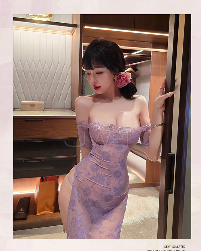 漫野玫瑰.純欲一字肩蕾絲柔美鏤空開衩連身睡衣 【連衣裙+T褲】