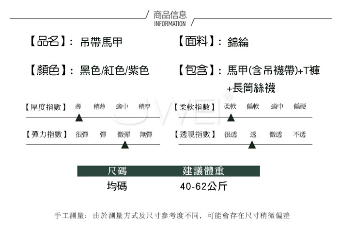 ■內容物:馬甲(含吊襪帶)+T褲+長筒絲襪