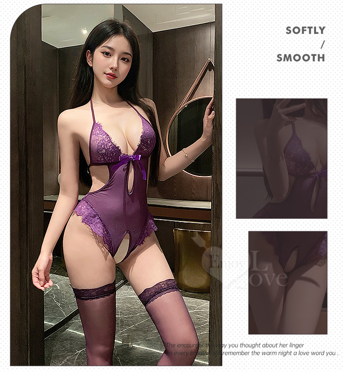 蕾絲綁脖透紗裸背連身衣|免脫開襠超誘惑﹝紫﹞