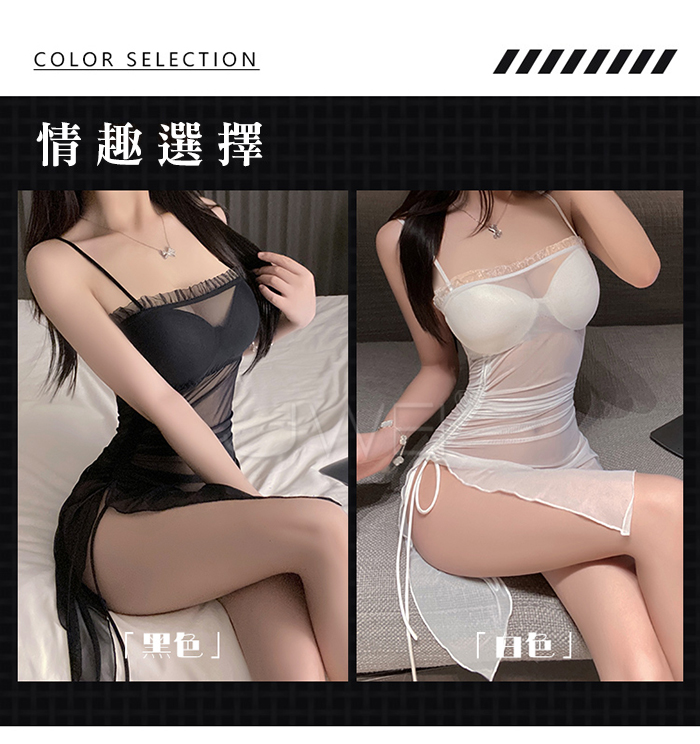 | 夜紗迷境.韻味透紗木耳邊飾側開衩抽褶收腰睡裙【睡裙+T褲-白色】