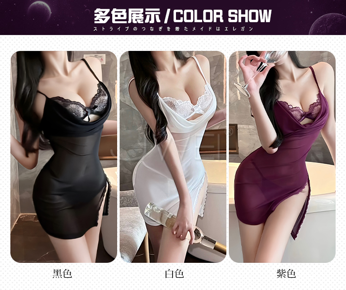►您現在的位置:首頁>月暮迷紗.性感裸紗蕩領透視側開衩細肩帶美背睡裙【睡裙+T褲-紫色】