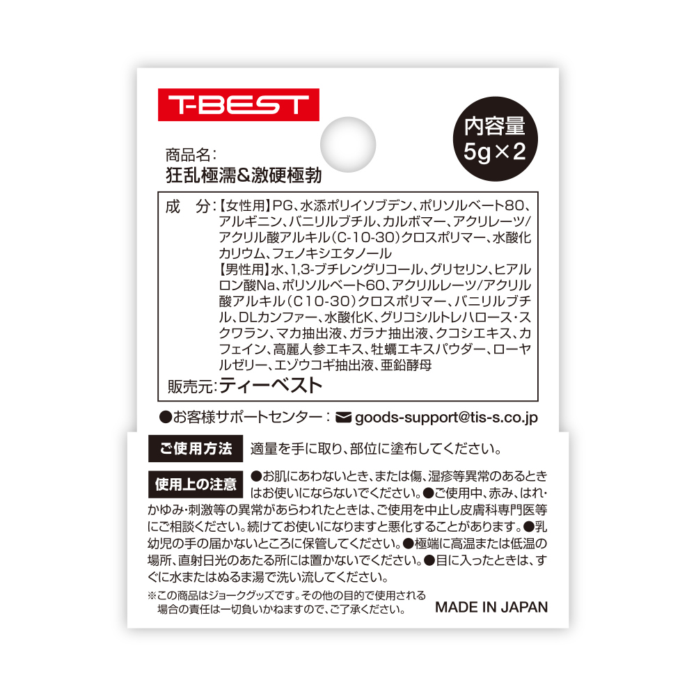 情侶們至愛的人氣高潮軟霜套裝! 與伴侶互相塗抹在私處敏感帶並享受性愛快感! 令人興奮的按摩霜套裝!人氣的女性高潮快感軟霜及男性激硬極勃軟霜組合套裝! 日本進口及製造。 男女按摩霜套裝。 用手指取少量塗抹在該私處區域。 推薦給想增添性事快感的情侶! 5g x 2。