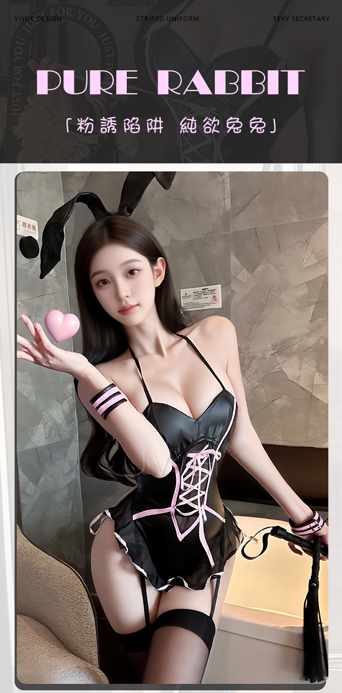 粉誘兔兔.萌系深V領口露胸仿皮美背露臀兔女郎COS裝【免耳髮箍+連身衣+手環+可拆卸毛球】
