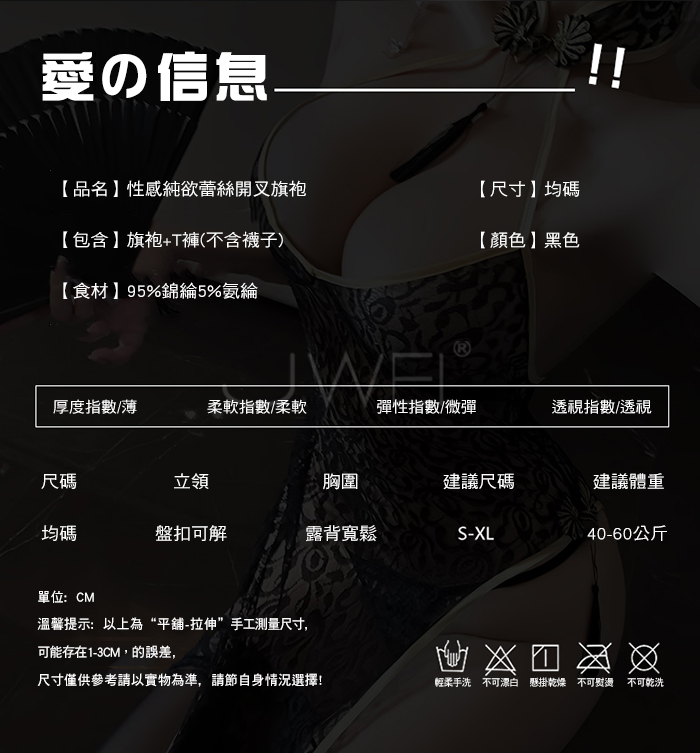 ■內容物:旗袍+T褲 ■適穿尺寸:FREESIZE ■彈性:微彈 ■未撐開平量尺寸正負誤差1~2cm,1吋=2.54cm ■注意事項:基於保障消費者個人衛生,此貼身衣物恕不接受退換貨。 (如為商品本身暇疵,接受七日內換貨,請勿試穿,謝謝您)