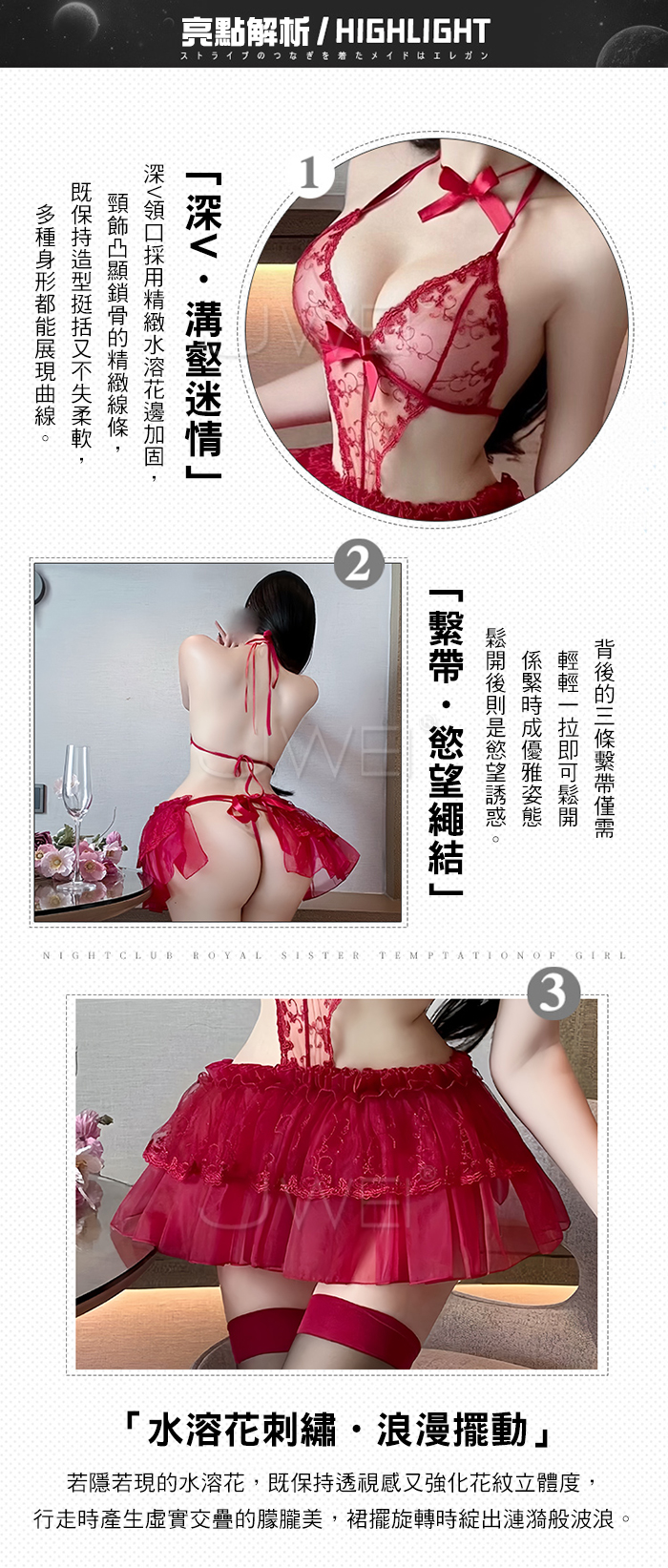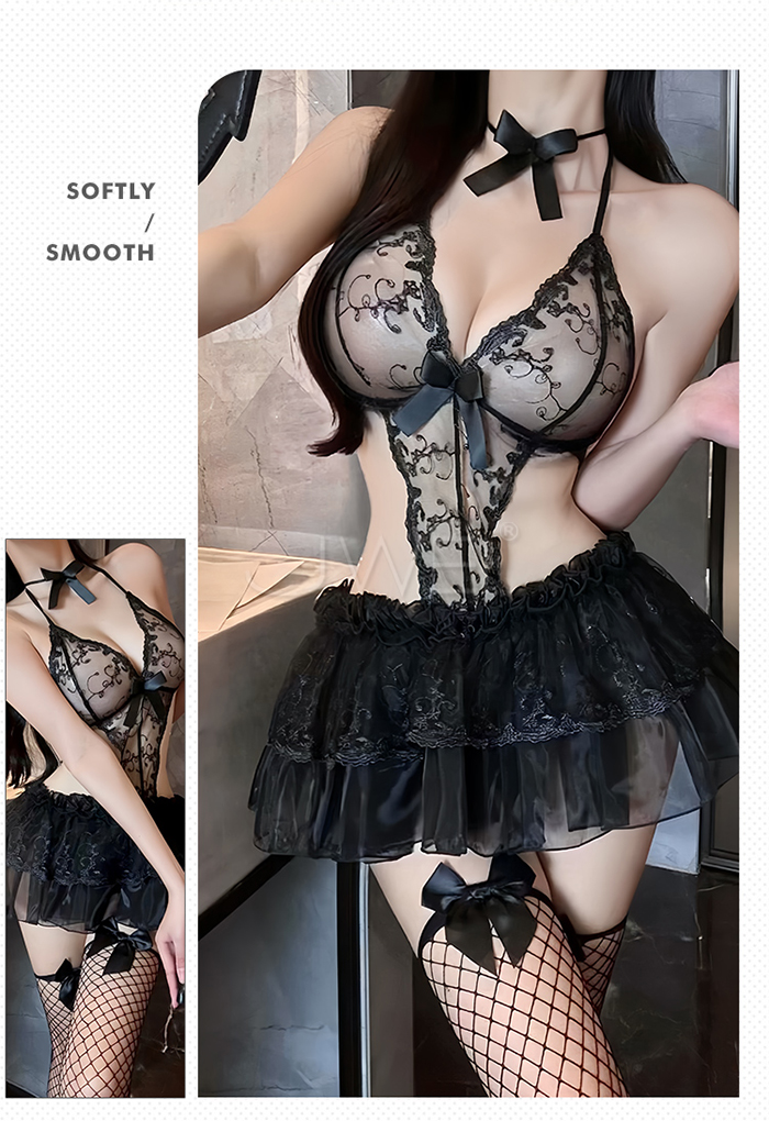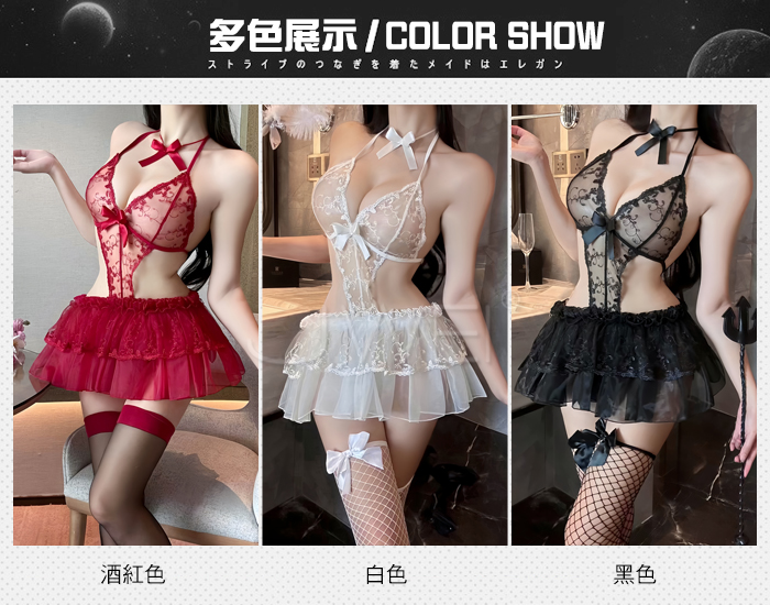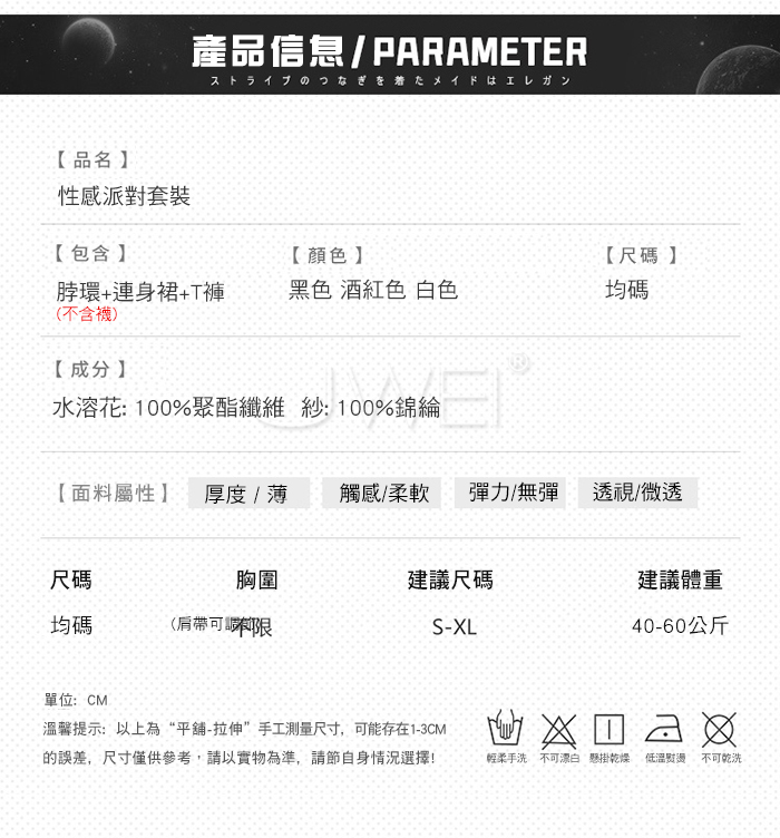 ■內容物:脖環+連身裙+T褲 ■適穿尺寸:FREESIZE ■彈性:微彈 ■未撐開平量尺寸正負誤差1~2cm,1吋=2.54cm ■注意事項:基於保障消費者個人衛生,此貼身衣物恕不接受退換貨。 (如為商品本身暇疵,接受七日內換貨,請勿試穿,謝謝您)