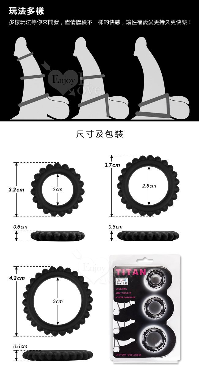 ►您現在的位置:首頁>【BAILE】TITAN 猛男鎖精持久三套裝凸齒環 - A款