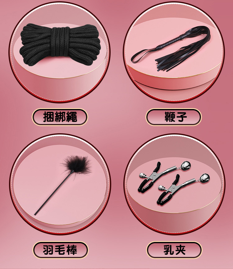 .內容物:皮革眼罩、蕾絲眼罩、口球、脖套+牽引繩、手銬、腳銬、繩子、鞭子、羽毛棒、乳夾。
