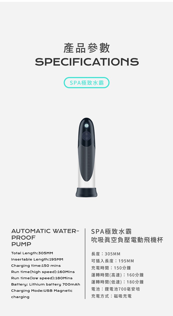 強力抽氣幫浦,釋放你的極致快感!專為追求極致體驗的你打造!這款幫浦擁有三種強力抽氣速度,任你挑選。全長30.5公分,口徑8公分,ABS材質堅固耐用,全機防水設計,無論是在浴室、浴缸還是房間,都能隨心所欲使用。獨家設計的寬厚矽膠套,密合效果極佳,配合水性潤滑劑使用更佳。內置壓力閥,讓你輕鬆控制壓力。USB磁吸式充電,方便快捷,讓你的享受無限延續。 給自己一個前所未有的放鬆體驗,立即入手!