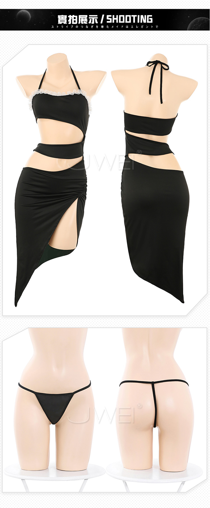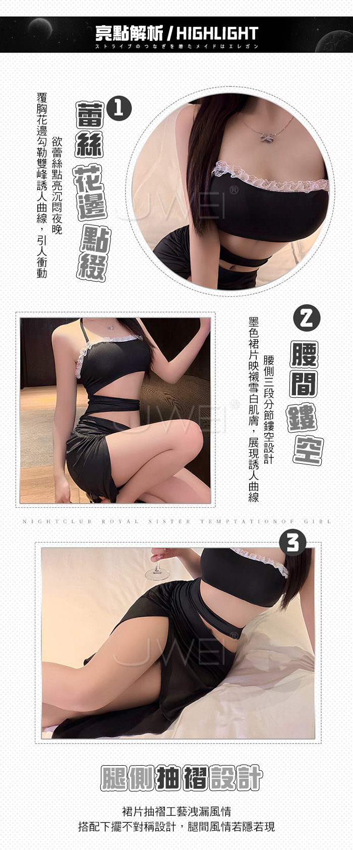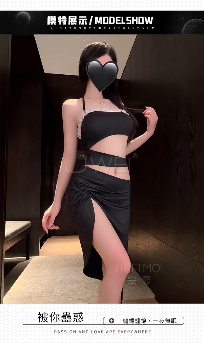 ►您現在的位置:首頁>月夜誘惑.胸口蕾絲花邊點綴側腰抽褶裙擺連身裙【連身裙+T褲】